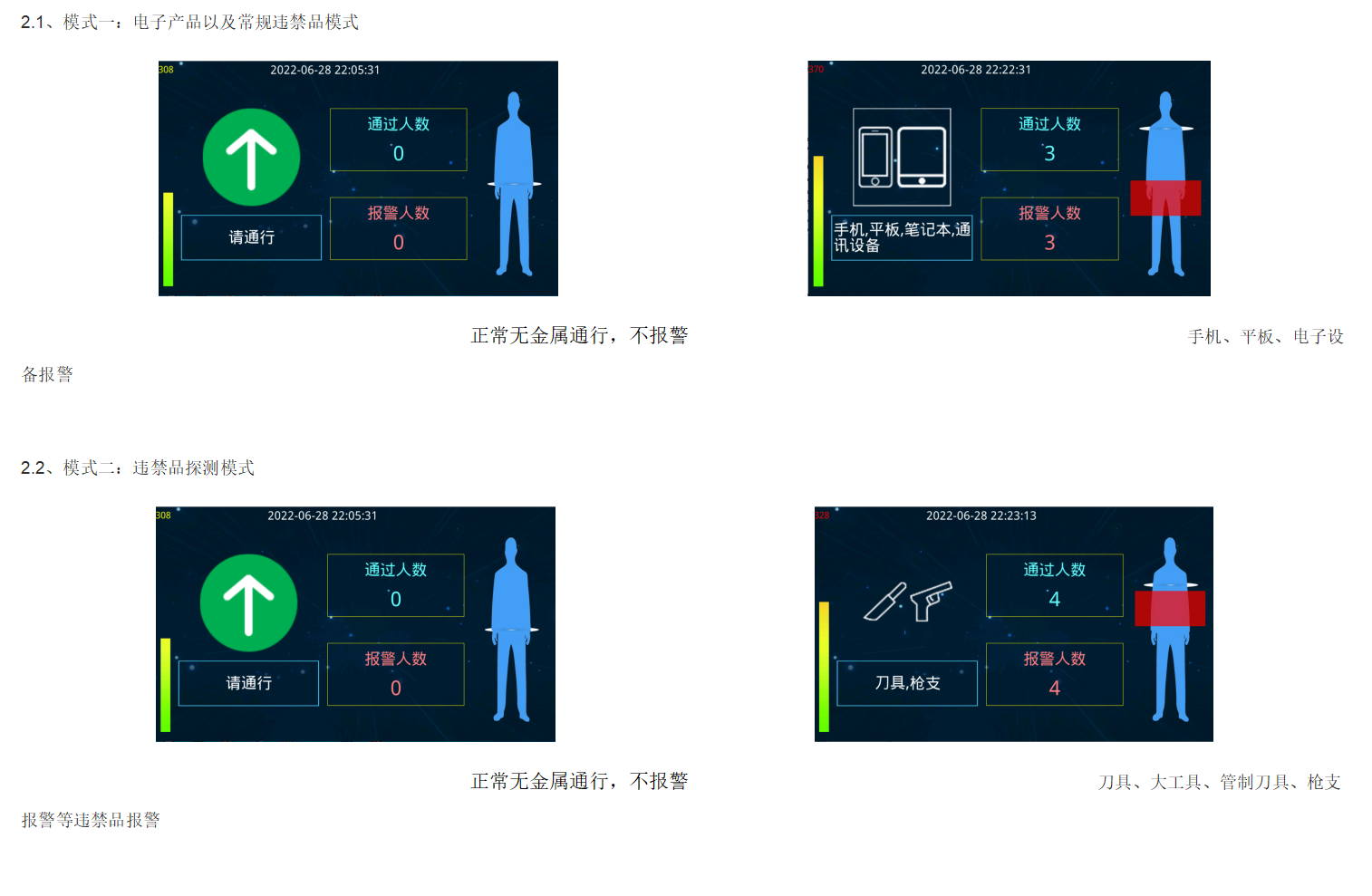 4、探測門至少有日常用品+違禁物品與全金屬探測2種模式的切換。